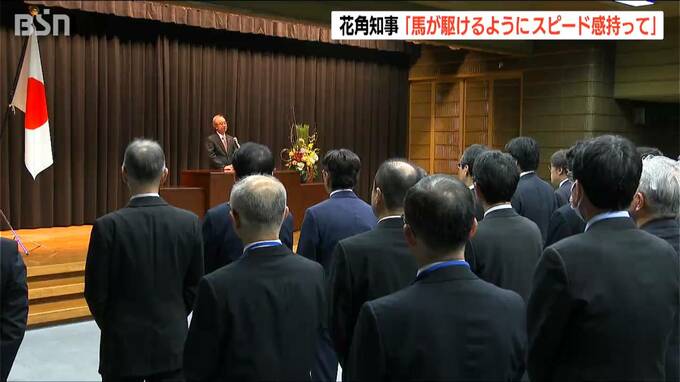 また、人口減少対策や県経済の活性化などのさまざまな県政課題に「馬が駆けるようにスピード感をもって迅速に対応していただきたい」とし、続いて行われた庁議でも、幹部職員に対して「前例にとらわれず果敢に挑戦してほしい」と呼びかけました。