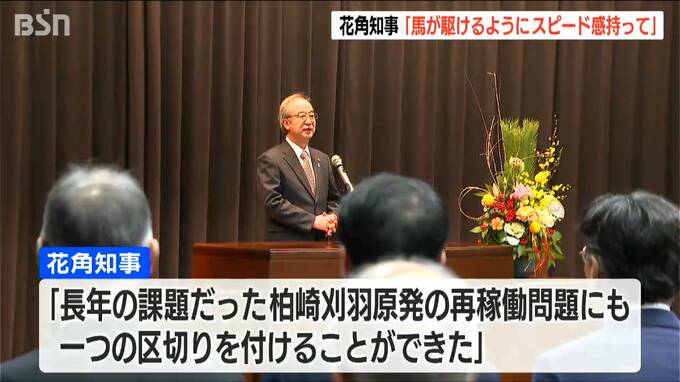 新潟県の花角英世知事は、年頭のあいさつで「馬が駆けるようにスピード感をもって課題に取り組んでいただきたい」と述べました。