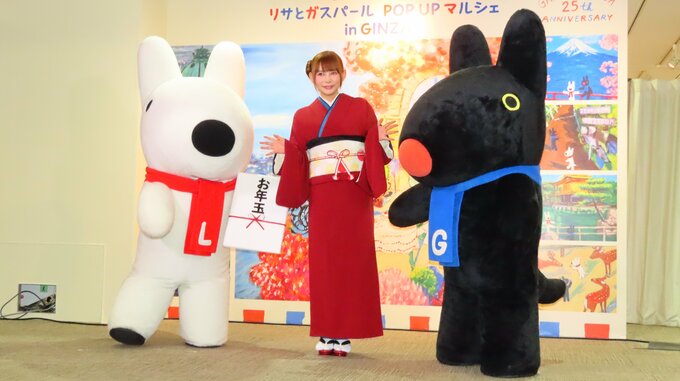 昨年9月末に双子を出産した中川さんは、新年らしいえんじ色の着物姿で登場。この日は仕事始めだと話すと、「リサとガスパール」に会い、‟縁起が良くとっても幸せ”と笑顔。以前から「リサとガスパール」を知っていた中川さんですが、‟最近母になったんですけども、世界の見え方が変わって、「リサとガスパール」の世界の見え方も変わったなと思いました”と語ると、‟まだお互いを認識していないんですけど、いつか喧嘩とかするんかなとか想像するだけでニヤニヤしちゃうし、その時には「リサとガスパール」を読んでもらってお互いをリスペクトして仲良くなってほしいって母として絵本を読めるようになって、本棚が輝いて見えます”と心境の変化を語りました。