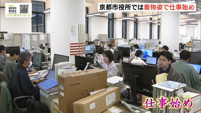 晴れやかな着物に身を包んだ職員たち。京都市役所では職員が着物姿で出勤しました。 西陣織など伝統の着物産業の振興や京都の文化を知るために2009年から始まった取り組みです。約250人の職員が参加し、職…