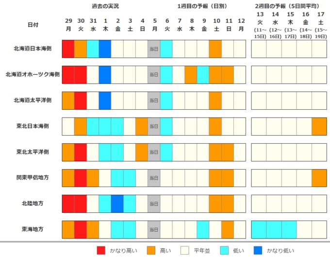 北海道地方の気温は、6日は低いでしょう。その後11日頃までは平年並か高いですが、12日頃からは平年並となるでしょう。
