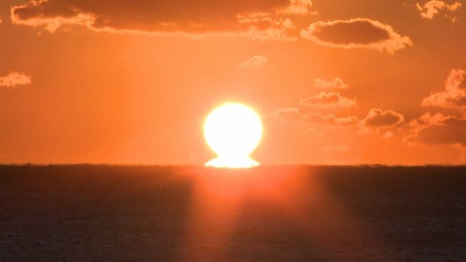 そして迎えた、日の出時刻。水平線上に残された、わずかに雲が無いエリアから、朝日が昇ってきました。現れたのは、丸い形で煌々と輝く、水平線の部分がくびれた、綺麗な「だるま朝日」でした。