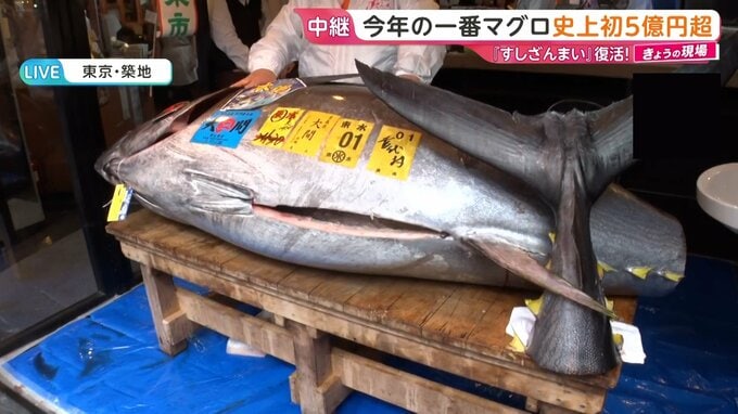 店頭には大きなクロマグロを一目見ようと、大勢の人でにぎわっていました。マグロの腹には一番マグロの証、「01」の札も付いています。