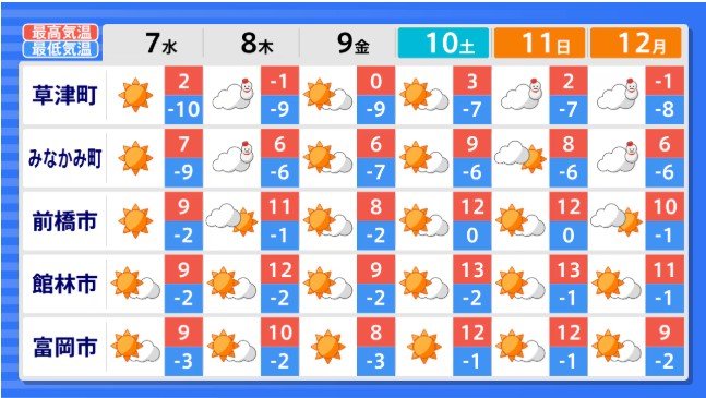 関東甲信地方では、12日頃から一時的に冬型の気圧配置が強まるため、長野県北部・群馬県北部を中心に降雪量がかなり多くなる可能性があります。交通障害や除雪などの対応に留意するとともに、農作物の管理に注意してください。