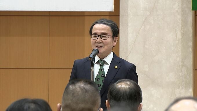 幹部職員50人を前に、年頭のあいさつをした池田知事です。昨年は県立アリーナの開業などで「新しい扉が開いた年」だったと総括しました。そして今年は、その先の「発展を掴み取る年」として企業立地の促進や定住・交流人口の拡大につながる政策を実行したいと話しました。