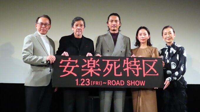俳優の奥田瑛二さんが映画「安楽死特区」の完成披露舞台挨拶に毎熊克哉さん、大西礼芳さんらとともに登壇しました。