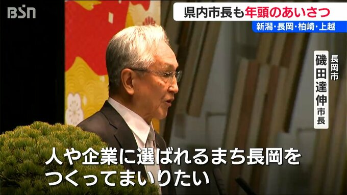 長岡市では、賀詞交換会の場で磯田達伸市長が「選ばれるまちをつくりたい」と挨拶。