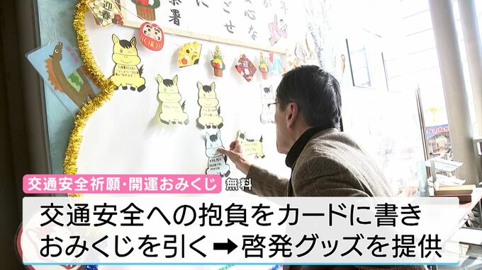 抱負や願い事を今年の干支・午の形のカードに書き込むと、おみくじを引くことができ、出た運勢に応じて、反射材などの啓発グッズがもらえるという仕組みです。