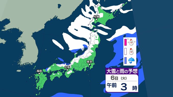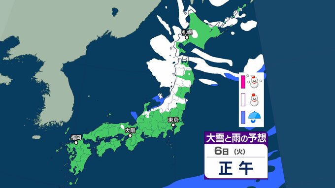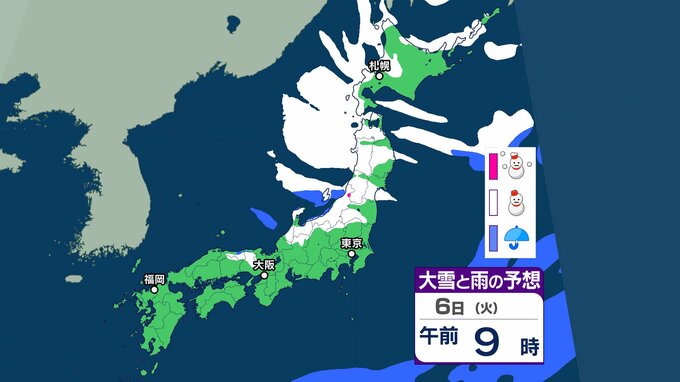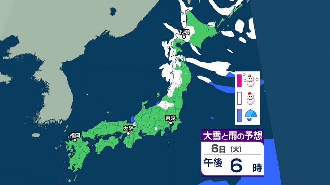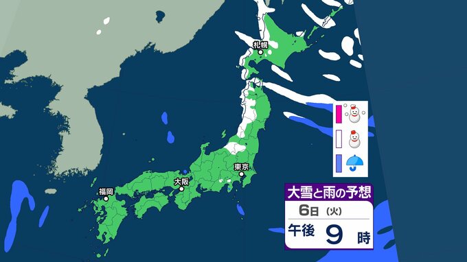 【大雪情報】全国的に今月7日(水)にかけて強風や風雪、高波に注意 東日本日本海側ではあす6日(火)にかけて大雪による交通障害のおそれ【気象庁 雪雨シミュレーション/5日午後7時更新】 RSK山陽放送 2026年1月5日(月) 18:58 国内 6日(火)雪と雨のシミレーションをみる 6日(火)3時間ごとの雪と雨のシミュレーション【画像④~⑪】 【画像④】 【画像⑤】 【画像⑥】 【画像⑦】 【画像⑧】 【画像⑨】 【画像⑩】 【画像⑪】