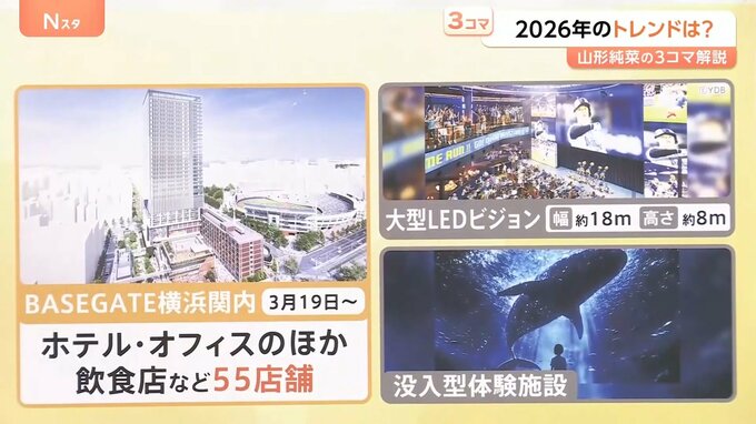 ホテル・オフィスのほか、飲食店など55店舗。また、幅約18m×高さ約8mの大型LEDビジョンや没入型体験施設などがあるそうです。