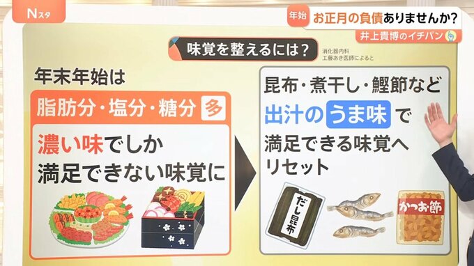 “食事負債”の改善方法について、消化器内科の工藤あき医師は「“制限”ではなく、“整える”。特に味覚、腸内環境を整えることが大切」だといいます。
