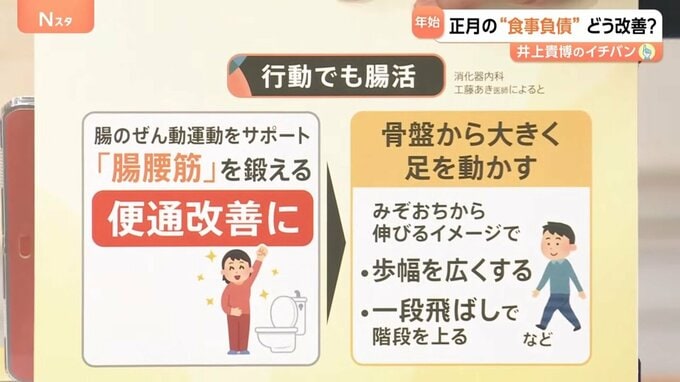 腸のぜん動運動をサポートする「腸腰筋」を鍛えると便通が改善。骨盤から大きく足を動かし、みぞおちから伸びるイメージで「歩幅を広くする」「一段飛ばしで階段を上る」など