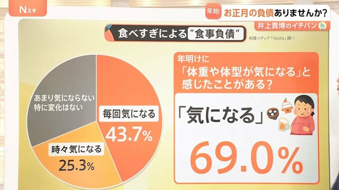 料理メディア「Nadia」の調査によると「年明けに体重や体型が気になる」と答えた人は全体の69.0%だったということです。