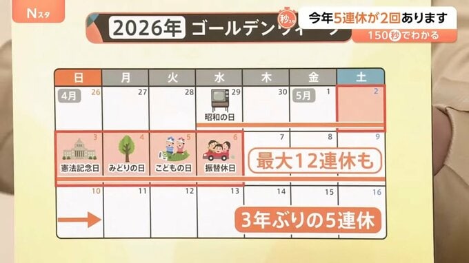 2026年のゴールデンウィークは、土日を含めて5連休になります。