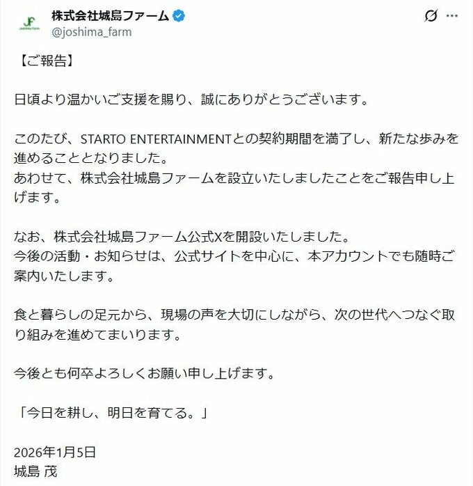 さらに、開設された公式Xでは、「このたび、STARTO ENTERTAINMENTとの契約期間を満了し、新たな歩みを進めることとなりました。あわせて、株式会社城島ファームを設立いたしましたことをご報告申し上げます。なお、株式会社城島ファーム公式Xを開設いたしました。今後の活動・お知らせは、公式サイトを中心に、本アカウントでも随時ご案内いたします」と、会社設立や公式Xの開設を改めて報告