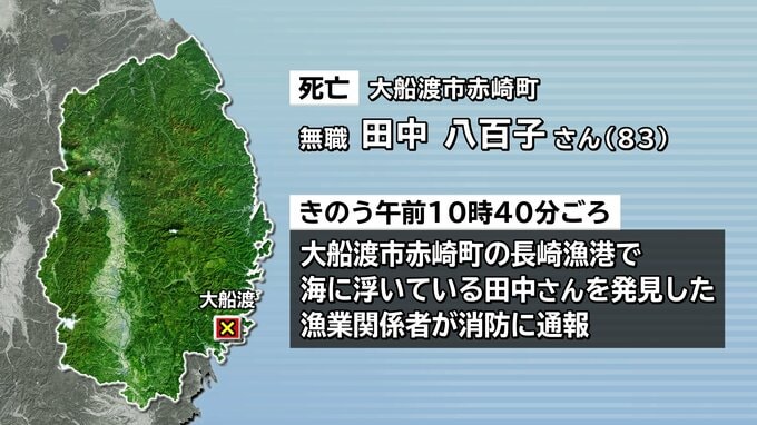 5日午前、岩手県大船渡市の漁港で80代の女性が海に浮いているのが見つかり、その後、死亡が確認されました。岩ノリを採っていて誤って海に転落したとみられています。亡くなったのは大船渡市赤崎町の無職・田中八…