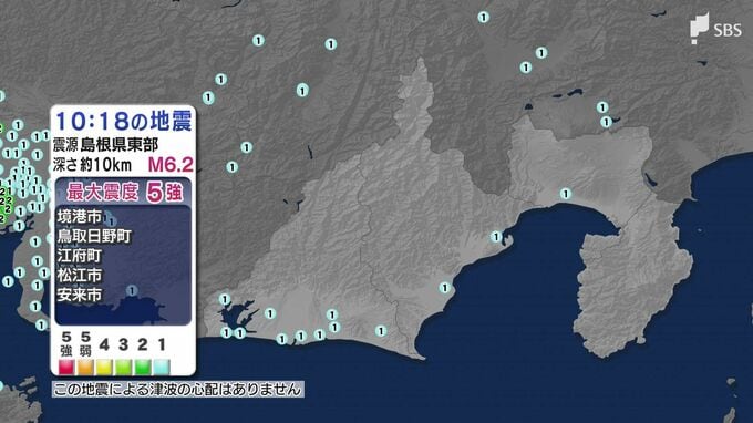 気象庁によりますと、震源地は島根県東部で、震源の深さは約10km、地震の規模を示すマグニチュードは6.2と推定されます。