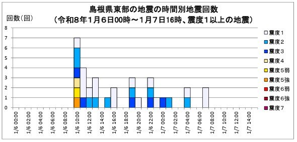 なお、島根県東部を震源地とする地震は、1月6日午前10時18分の震度5強以降、震度5弱が1回、震度4が1回、震度3が5回、震度2が9回、震度1が16回で、震度1以上の揺れを33回観測しています。(7日16時現在)