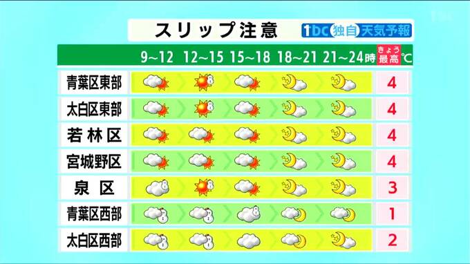 仙台市内では、6日の最高気温が5℃に届かない予想となっています。昼過ぎにかけては東部でも雪が降りやすく、スリップに注意が必要です。