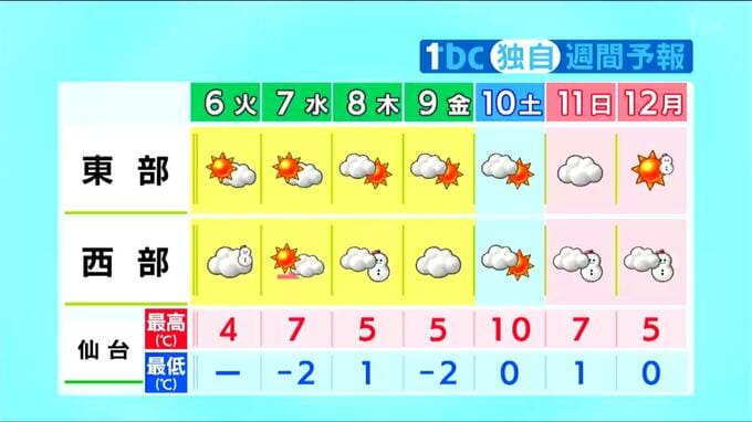 東部は晴れ間の広がる日が多くなりますが、西部では雪の降る日が多くなる見込みです。また、気温は日によってアップダウンが大きくなりそうです。