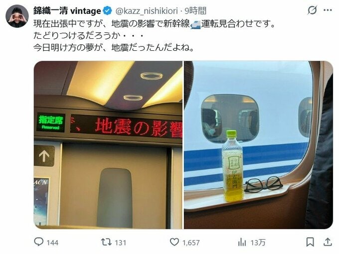 10時59分、錦織一清さんは「現在出張中ですが、地震の影響で新幹線 運転見合わせです。」と、投稿。