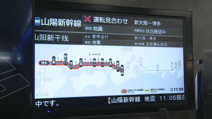この地震の影響で山陽新幹線の岡山~広島間で運転を見合わせていて、午後1時ごろに運転を再開する見込みです。
