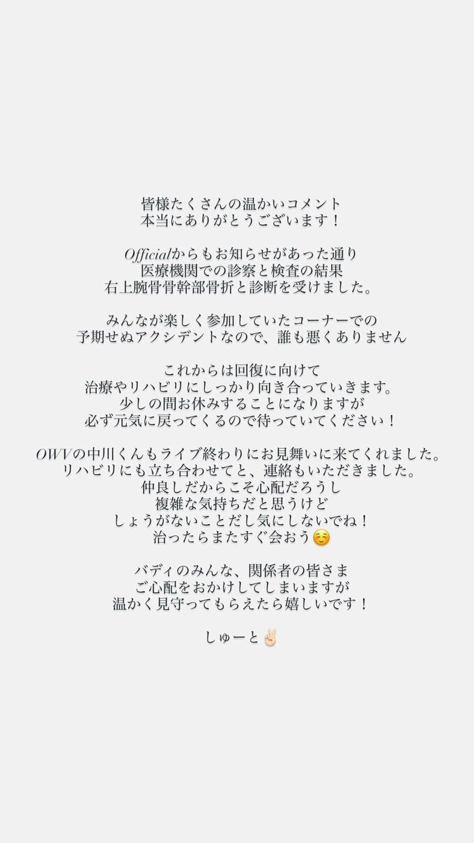 また森愁斗さんは自身のインスタグラムのストーリーズを更新。「みんなが楽しく参加していたコーナーでの予期せぬアクシデントなので、誰も悪くありません」と投稿。続けて「これからは回復に向けて治療やリハビリにしっかり向き合っていきます。」「少しの間お休みすることになりますが必ず元気に戻ってくるので待っていてください!」と綴っています。