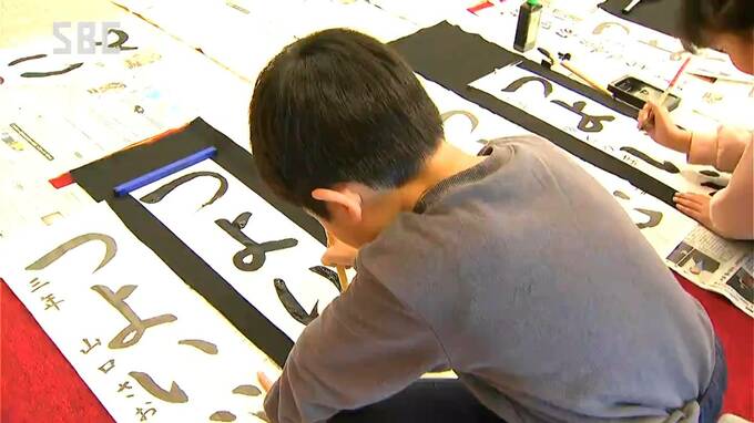 市が主催し30年以上続く新春恒例の行事で、子どもたちは市内の書道愛好家からおよそ2時間にわたって指導を受けながら、思い思いの文字をしたためていました。