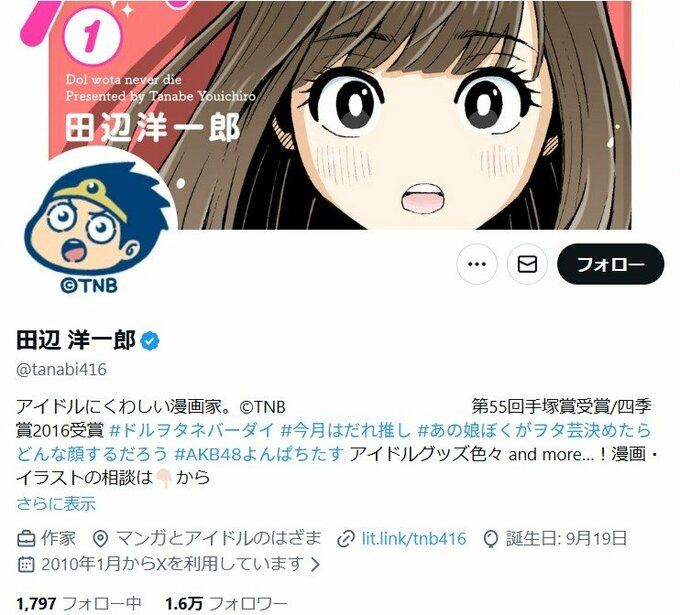 田辺洋一郎氏のXのプロフィール欄には「アイドルにくわしい漫画家。」「第55回手塚賞受賞/四季賞2016受賞」と、記されています。