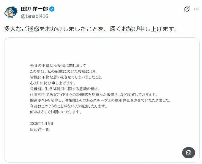 続けて「肖像権、生成AI利用に関する意識の低さ、仕事相手であるアイドルとの距離感を見誤った傲慢さ、など反省しております。」と、しました。