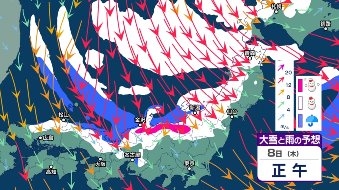 このため、北日本と北陸地方では8日は大雪による交通障害、着雪、なだれに注意。全国的には、強風、風雪、高波に注意し、北海道地方と北陸地方では暴風雪、高波に注意・警戒が必要だとしています。