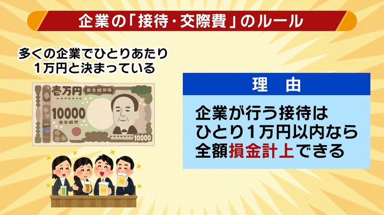 多くの企業で「ひとりあたり1万円」と決まってる接待・交際費。企業が行う接待はひとり1万円以内なら全額損金計上できるためです。