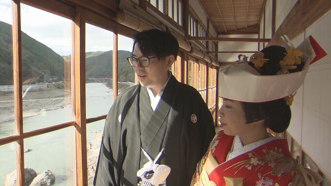 結婚式当日。 旅館いちばんの自慢、廊下から望む球磨川を背景に、夫婦は写真を撮りました。