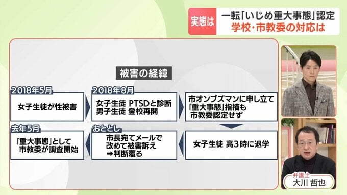 端的に言うとあり得ないと思う。いじめ防止対策推進法という法律がありまして、それによると、いじめにより生徒が心身に重大な被害が生じた疑いがあるときは、相当の期間、だいたい年間30日と言われていますが、欠席を余儀なくされているようなときには『重大事態』と認定して、調査を行わなければなりません。男子生徒は処分を受けたということで、要件には合致していると思うが、なぜ2018年に認定しなかったのかというのは、ちょっとたやすく理解できない。