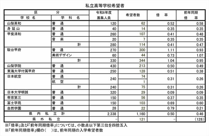 【全高校掲載】中学3年生の第2次進路希望調査 全日制公立高校の全体は0.95倍で過去最低 山梨