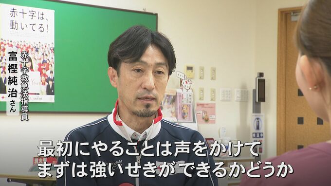 日本赤十字社石川県支部 富樫純治 赤十字救急法指導員「最初にやることは声をかけて、まずは『強い咳』ができるかどうか。もし強い咳ができず物が出てこなければ、その時点で119番通報をして救助の手配をしてください」