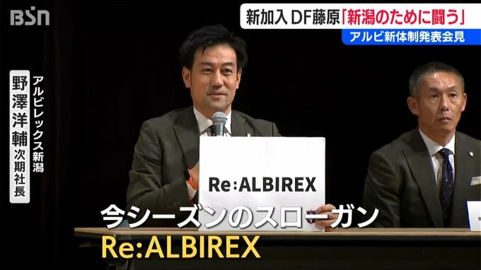 【野澤洋輔 次期社長】「今シーズンのスローガンRe:ALBIREXです。再出発、再挑戦、再確認いくつもの意味が込められています」