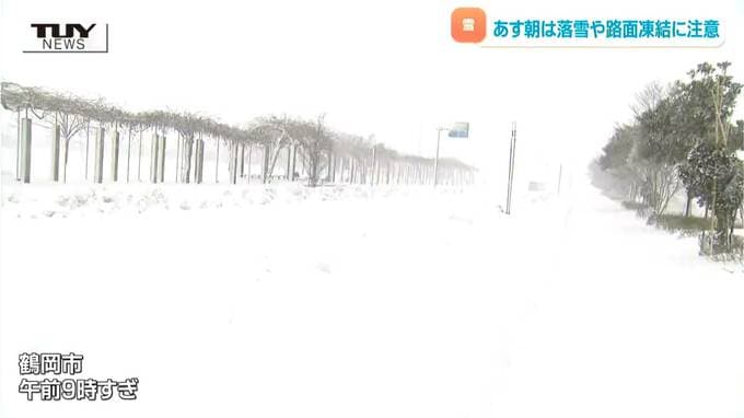 午前9時過ぎの鶴岡市です。横殴りの雪が降り、木々が大きく揺れています。道路標識などが雪に覆われ、ライトを付けて走行する車も見られます。