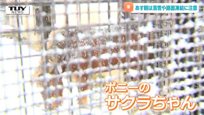 突然の雪に驚いているのかはたまた喜んでいるのか、檻を駆け回っているのはポニーのサクラちゃんです。