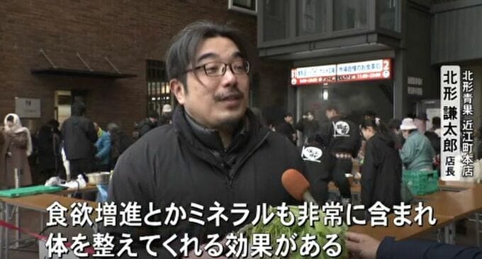 北形青果近江町本店・北形謙太郎店長「七草粥にはせり、なずな、ごぎょう、はこべら、ほとけのざ、すずな、すずしろという七つの野草が入っています」「年末年始に弱った胃腸を整えるという効果があると言われているので食欲増進とかミネラルも非常に含まれているので体を整えてくれる効果がある」