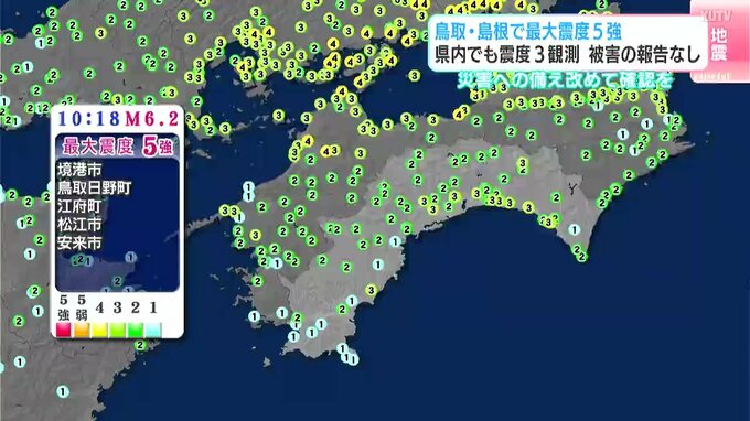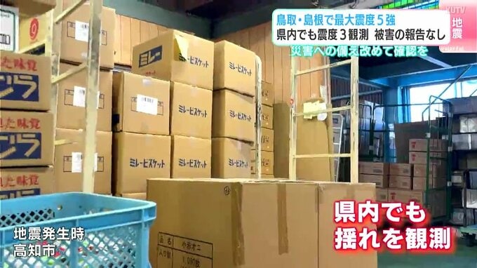 6日午前、山陰地方を震源とする地震が相次ぎ、最も規模が大きかった1度目の地震では、高知県内でも震度3を観測しました。これまでに県内での被害は確認されていません。