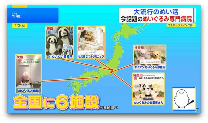 傷ついたぬいぐるみを治療してくれる「ぬいぐるみ専門病院」。番組で調べたところ、このような施設は全国に6か所みつかりました。