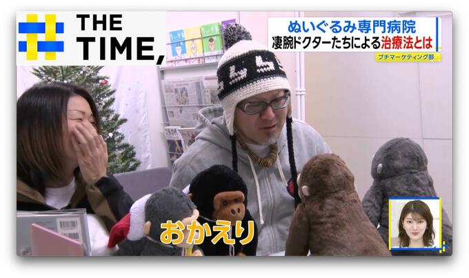 取材した日に退院するゴリラのぬいぐるみ、ゴリくん・ゴリ助くんを迎えにきた保護者さんは、「おかえり~」と満面の笑み。くたくたになっていた体も、ふっくらしっかり。出会った時の色や形に生まれ変わった姿に「座っていられなかったのに、見違えるようになった」と大感激の様子です。