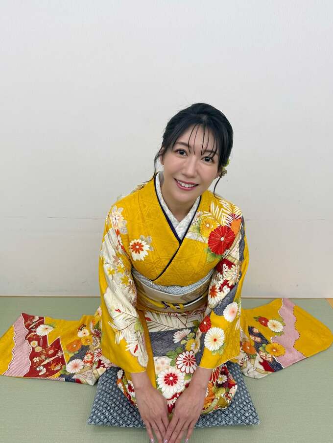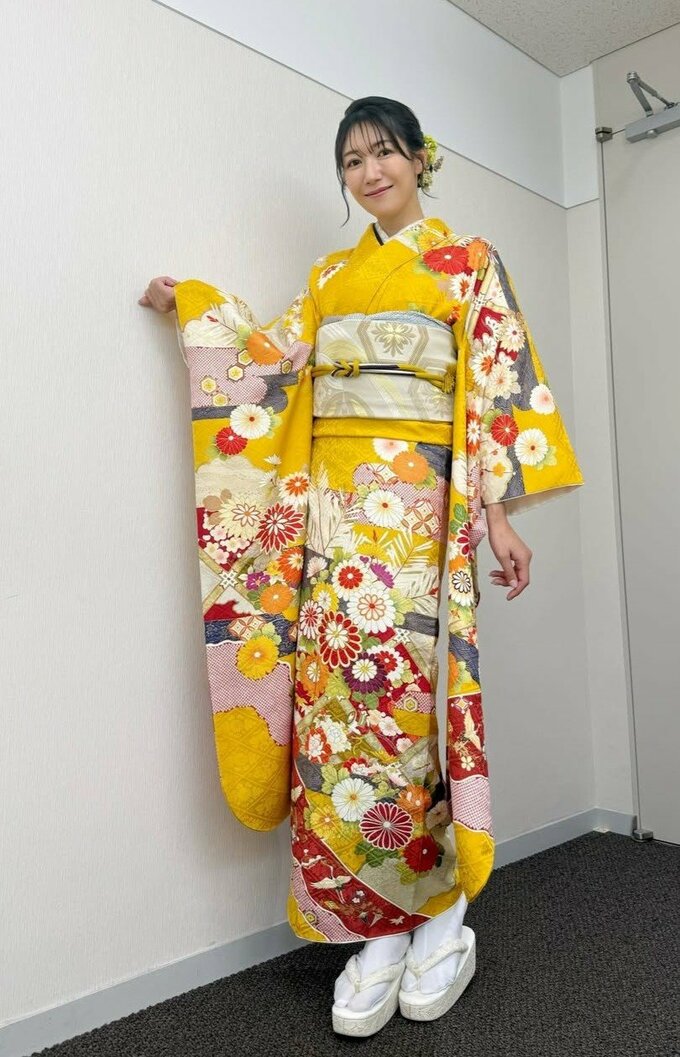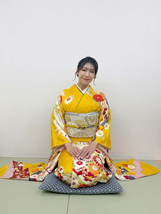 穂川さんは「今年も素敵なお着物を着せていただきました♡」とテキスト。控え室と思われる室内の畳の上で、正座で挨拶する穂川さんは、目にも鮮やかな深い黄色に数々の大菊をあしらった振袖に、白銀の帯を合わせています。