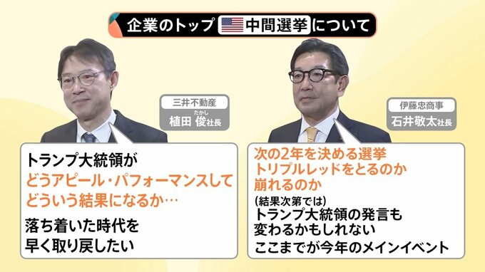 そして、▼伊藤忠商事の石井敬太社長は、「次の2年を決める選挙。トリプルレッドをとるのか、崩れるのか。(結果次第では)トランプ大統領の発言も変わるかもしれない。ここまでが今年のメインイベント」と語りました。