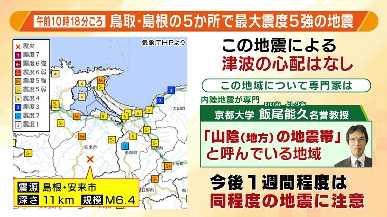 内陸地震が専門の京都大学・飯尾能久名誉教授によると「山陰(地方)の地震帯」と呼んでいる地域だということで、大きな地震だけではなく震度1や震度2の揺れも含めて地震が多い地域です。