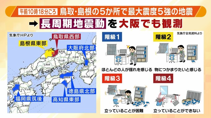 今回の地震では、▽鳥取県西部で階級4、▽島根県東部で階級2、▽大阪府北部・徳島県北部・高知県東部・福岡県筑後で階級1が観測されました。
