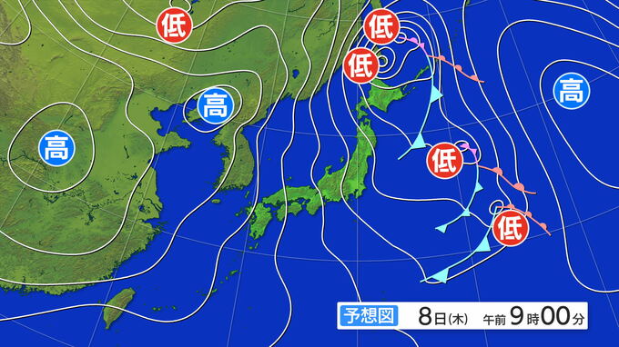 8日(木)は、西高東低の冬型の気圧配置になるため寒さが続いて、しかも「北風」の冷たい一日でしょう。