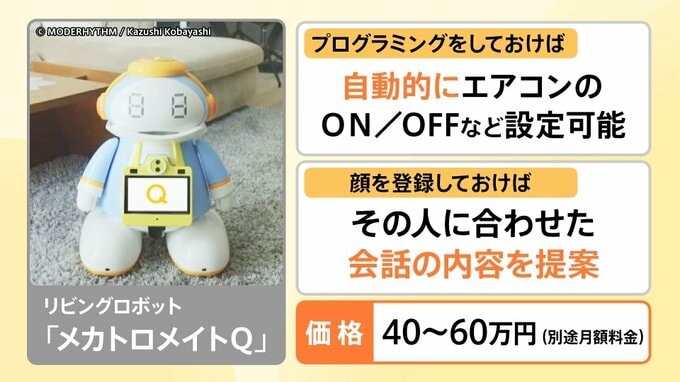 「メカトロメイトQ」は、▼プログラミングをしておけば、自動的にエアコンのON/OFFなど設定可能、▼顔を登録しておけば、その人に合わせた会話の内容を提案してくれるということです。価格は40~60万円(別途月額料金)で、来年度発売予定です。