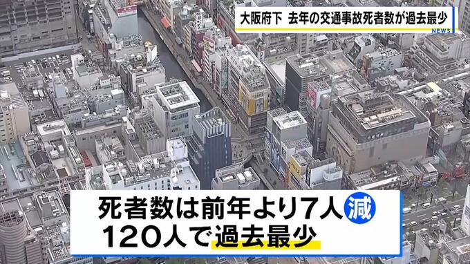 大阪府警は、府内で去年1年間に交通事故で死亡した人の数が過去最少だったと発表しました。 大阪府警によりますと、去年1年間に府下で起きた交通事故の件数は2万5008件でした。(昨年比+228件) 一方…